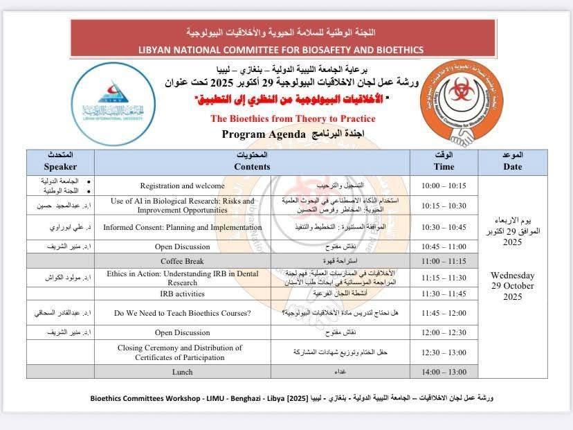 The workshop was held on Wednesday, October 29, 2025, in Benghazi, organized by the National Committee for Biosafety and Bioethics, in collaboration with ethics committees from Libyan universities and research institutions.